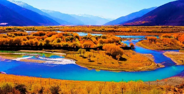 林芝五彩斑斕的樹林、碧綠的河水、滿目的冰川雪山,共同點綴出一個夢幻的童話世界。