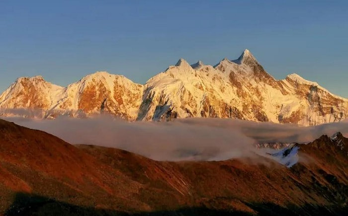 從魯朗東巴才村有一條通往山上的路,沿山路爬升1000多米高度,路的盡頭便是拜峰臺,是觀賞南迦巴瓦峰的絕佳去處,在海拔4600米的山口直面正對著南迦巴瓦峰,向下俯瞰即是世界最大的峽谷—雅魯藏布大峽谷。遊人如織的夏季,雲纏霧繞下的南迦巴瓦偶露真容。但在秋季,這柄“直刺藍天的戰矛”在澄澈的藍天下完美呈現。