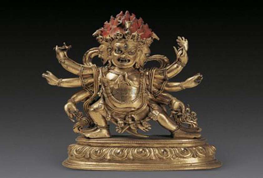他把家傳的圣像,裝藏在神像腹內,使他變得無比威猛和靈驗。這尊馬頭明王三頭六臂,居中的臉是紅色的,左邊的臉是藍色的,右邊臉是白色的,頭頂有一綠色馬頭,張著血盆大口,圓睜三只眼睛。面部表情十分兇惡,總是怒氣沖沖的樣子。頭戴五骷髏冠,身穿虎皮裙。
